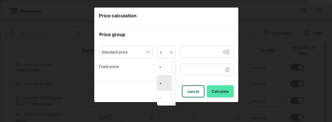In addition to the "multiplication", an "addition", or "subtraction" of a specific value can also be carried out. For example: If a surcharge of € 1 is to be added to the standard price for "Delivery", click on the "Edit" button for "Delivery", select the "Standard price", select the "Addition" ("+") icon, and enter the number 1. This automatically adds an amount of € 1 to the price in the delivery column, based on the standard price.