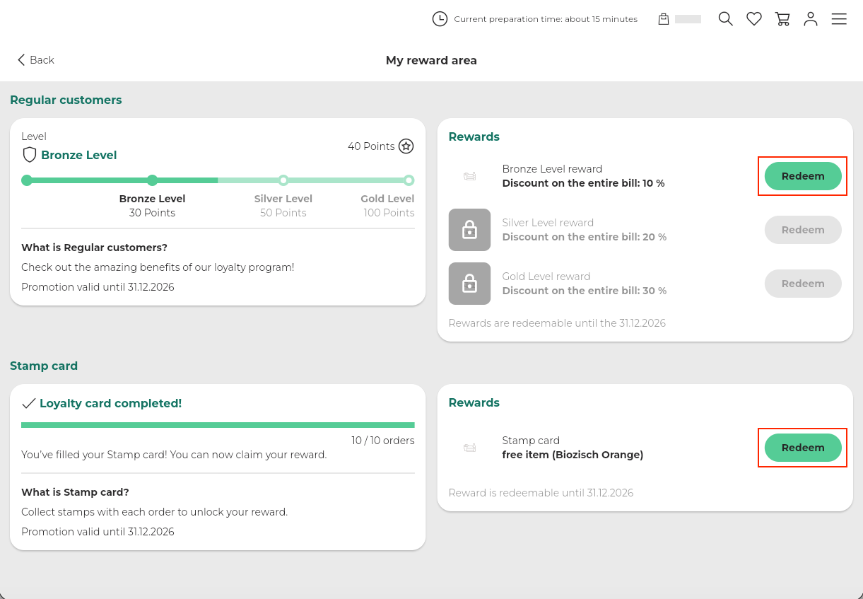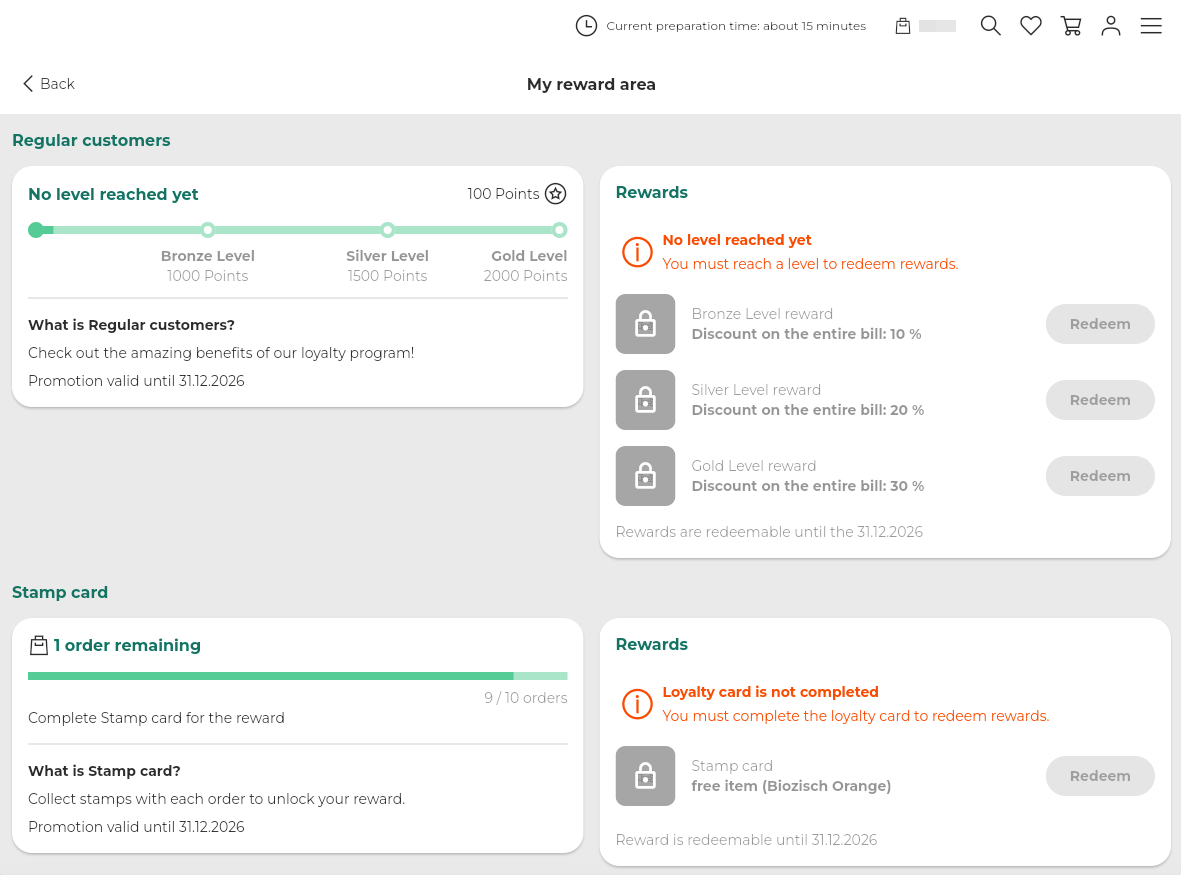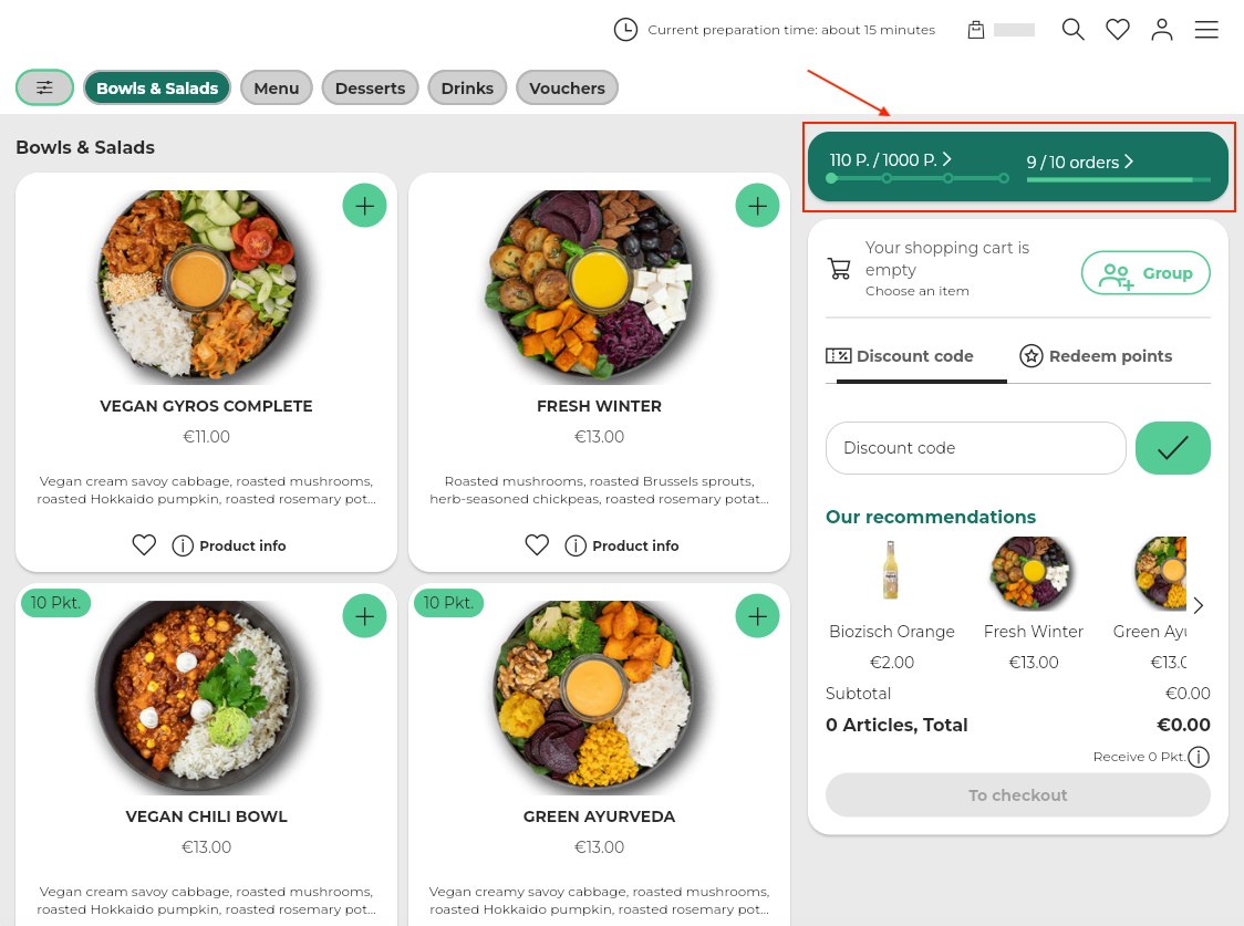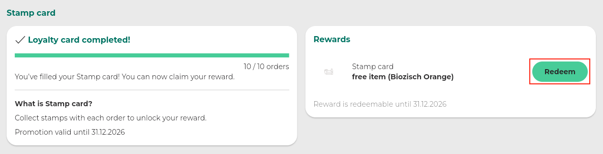 Note: If the reward is not redeemed immediately, the progress remains at e.g. 10/10. The counter is only reset after redemption. Any further orders in the meantime are recorded and taken into account in the progress after redemption. In the event of a cancellation, the counter is reduced accordingly.
