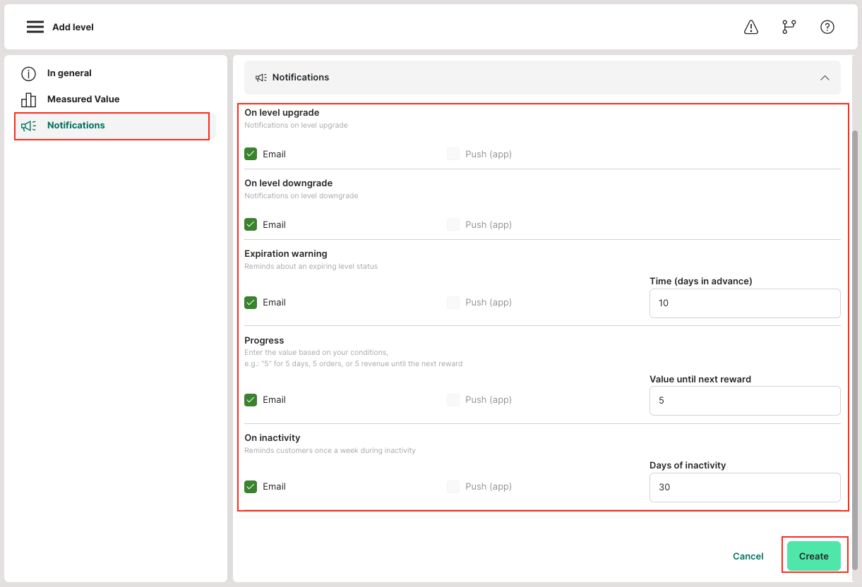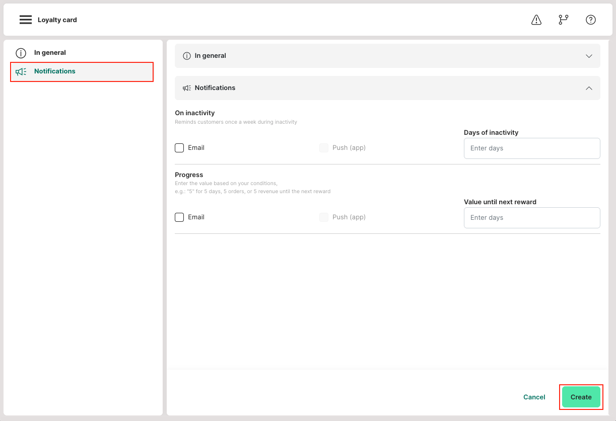 - Optionally configure under "Notifications" when customers should be informed, e.g. in case of inactivity or progress towards the next reward. These settings can be adjusted afterwards.