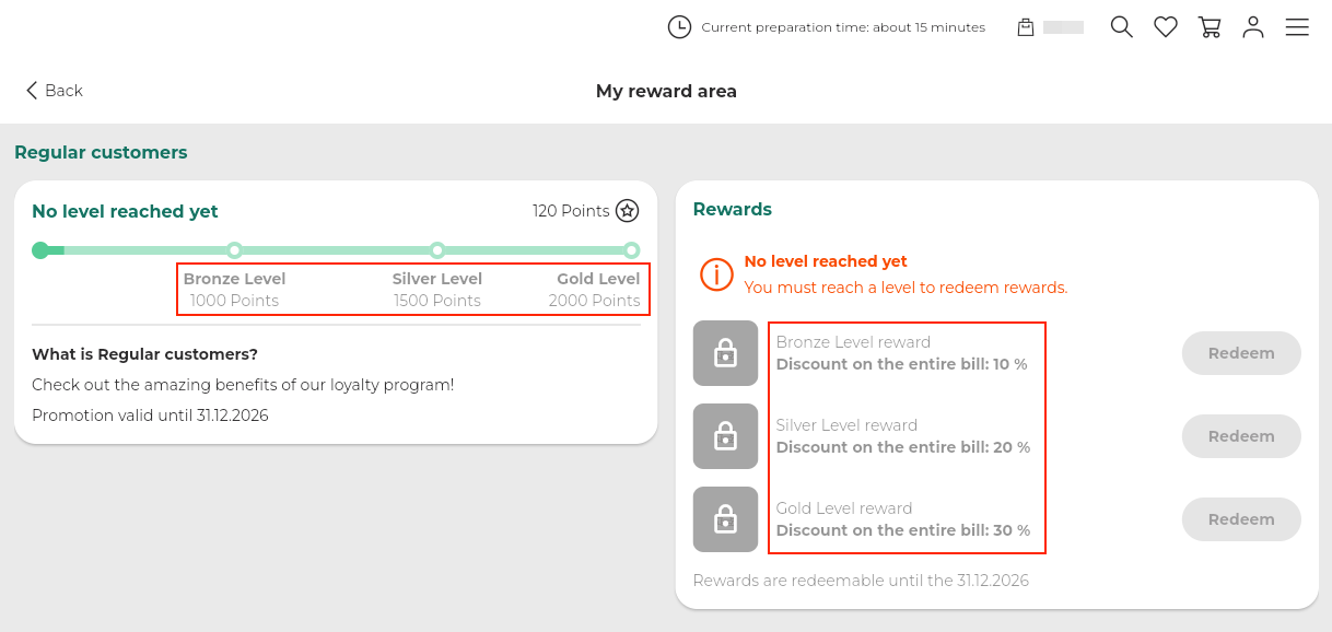 - Loyalty levels: The current level and its associated rewards are displayed (e.g. Bronze, Silver, Gold)