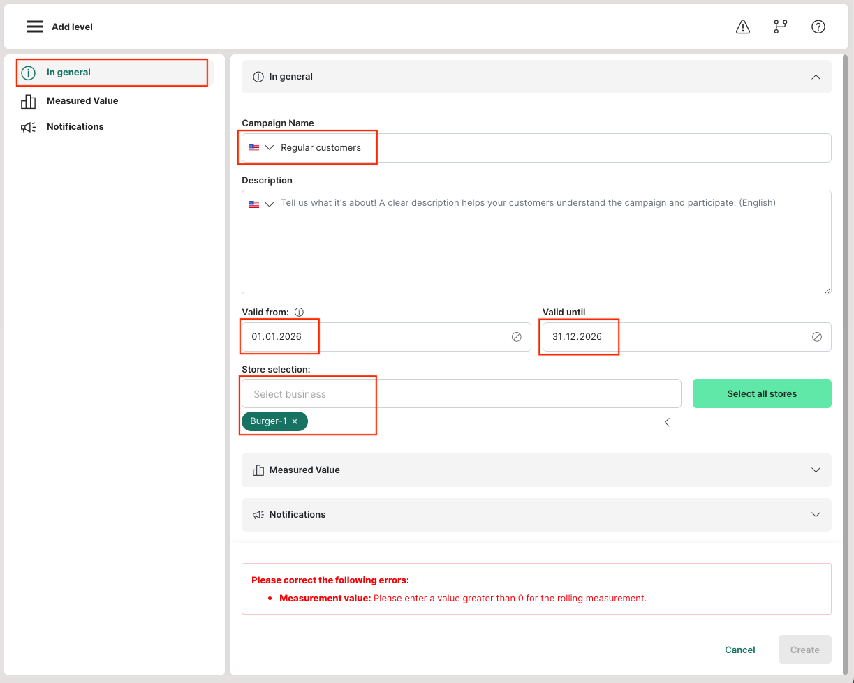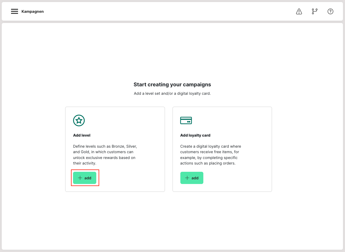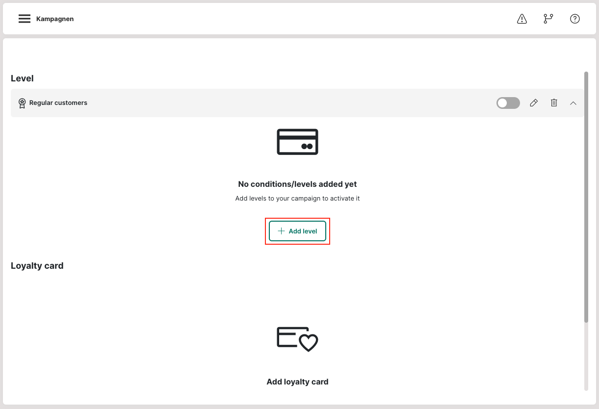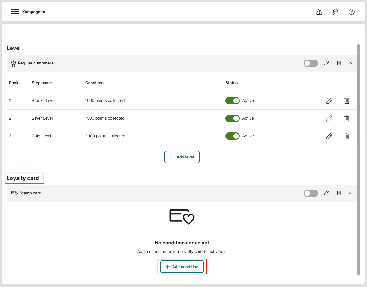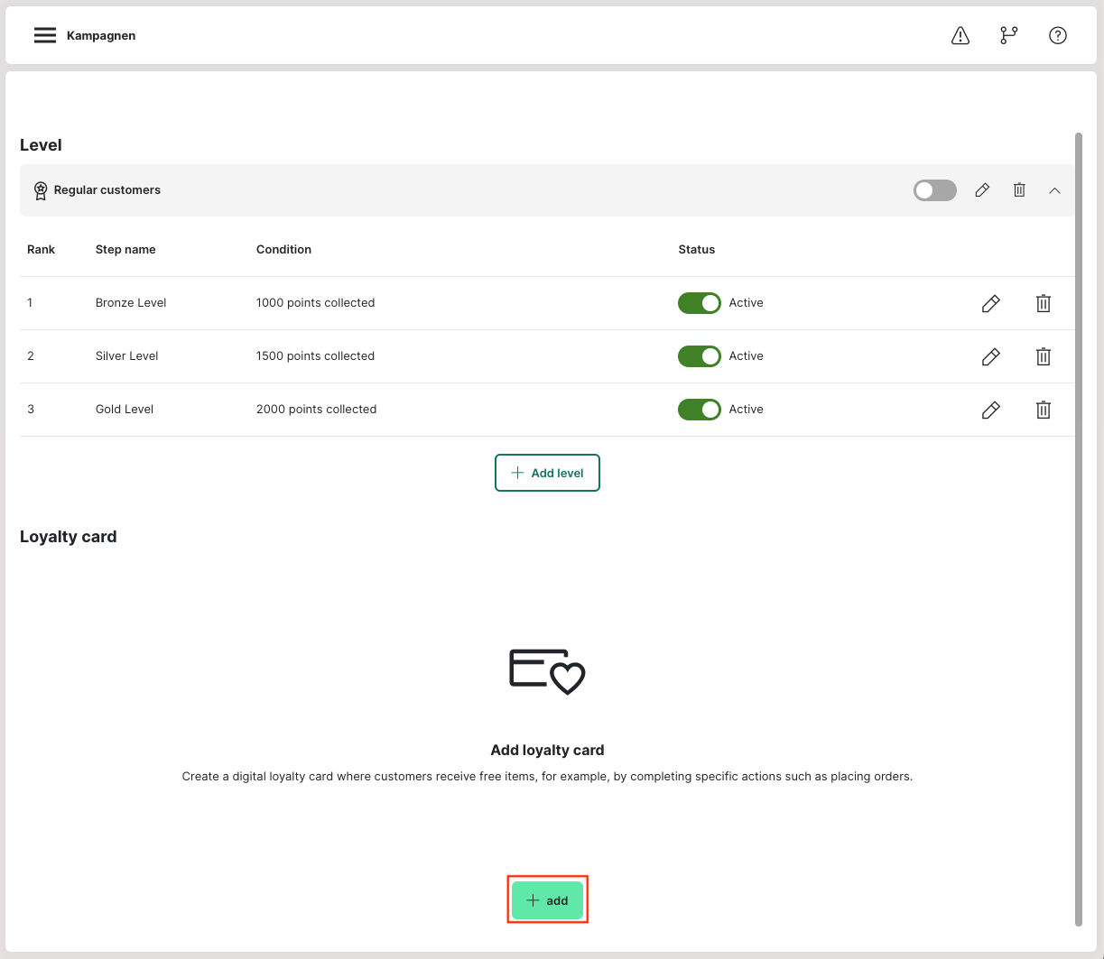 Note: Only one loyalty level campaign can be created, e.g. "Regular customers". Within this campaign, however, multiple conditions can be defined, e.g. Bronze, Silver, and Gold. These are explained in the next step.