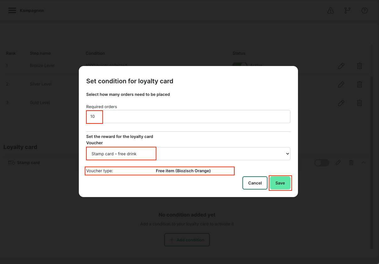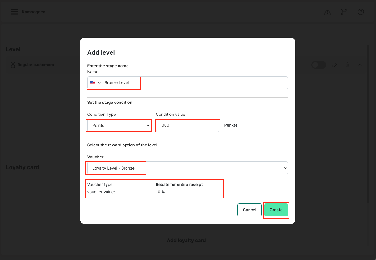 Once all vouchers have been created, you can set up the actual loyalty campaign for the level.