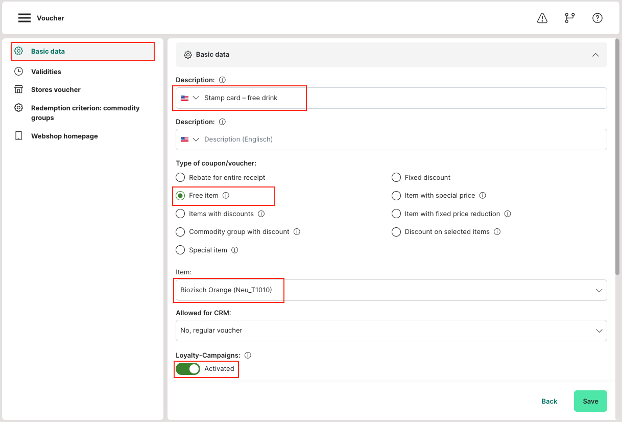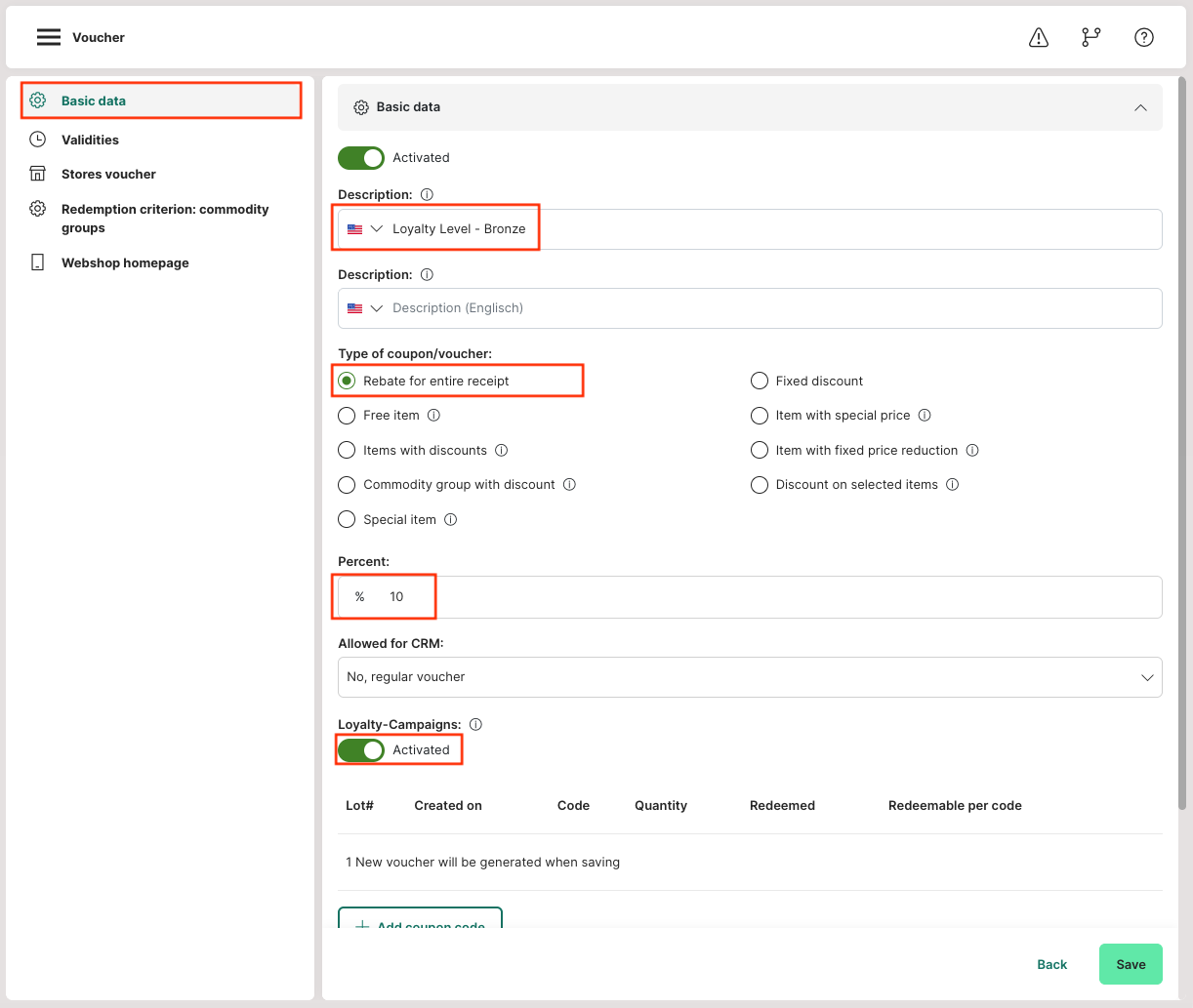 - Enable the "Loyalty-Campaigns" option so the voucher is available for the loyalty campaign.