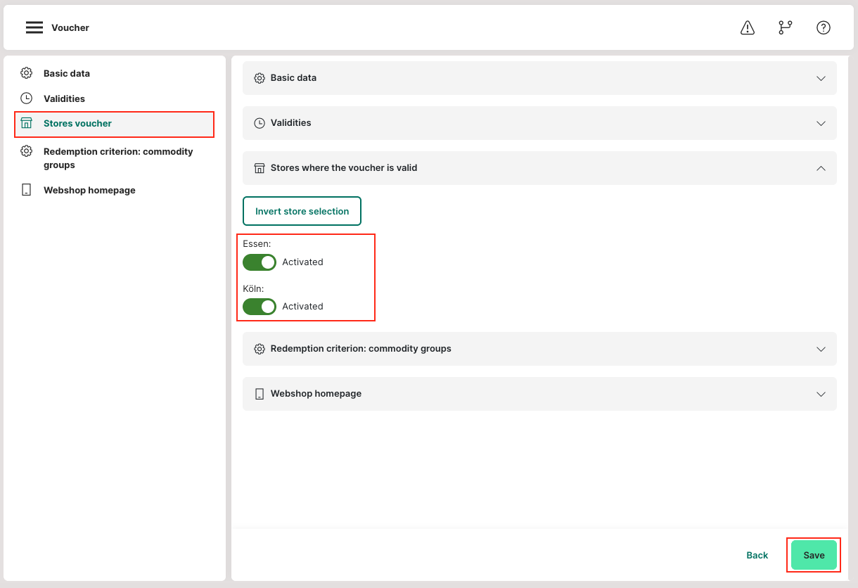- In the "Stores voucher" section, define the stores in which the voucher is valid.