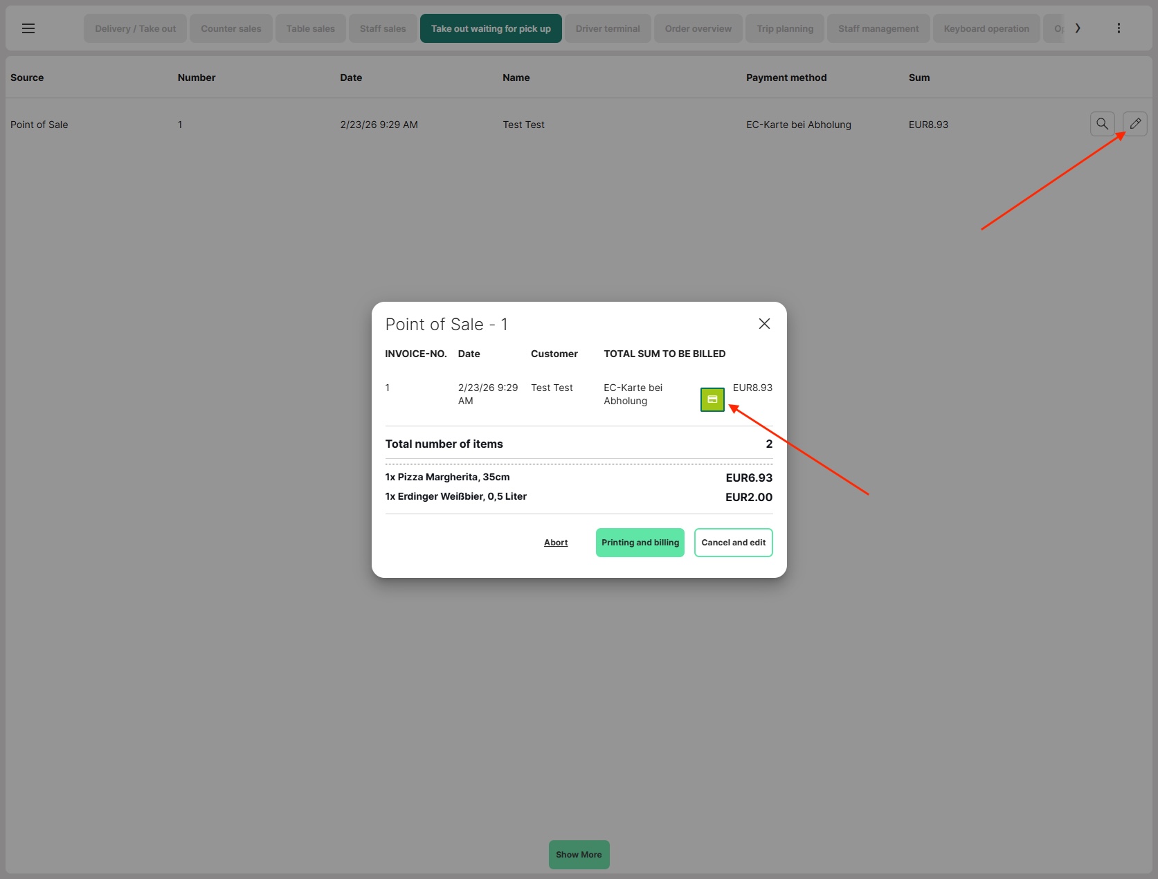 - Pickup orders are now listed under the new section "Take out waiting for pick up" in the POS and must be processed there when the customer arrives.