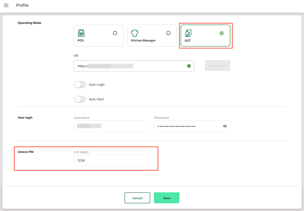 Additionally, you can store login credentials, configure automatic start options, and, in self-ordering terminal (SOT) mode, set a PIN to unlock the kiosk mode.