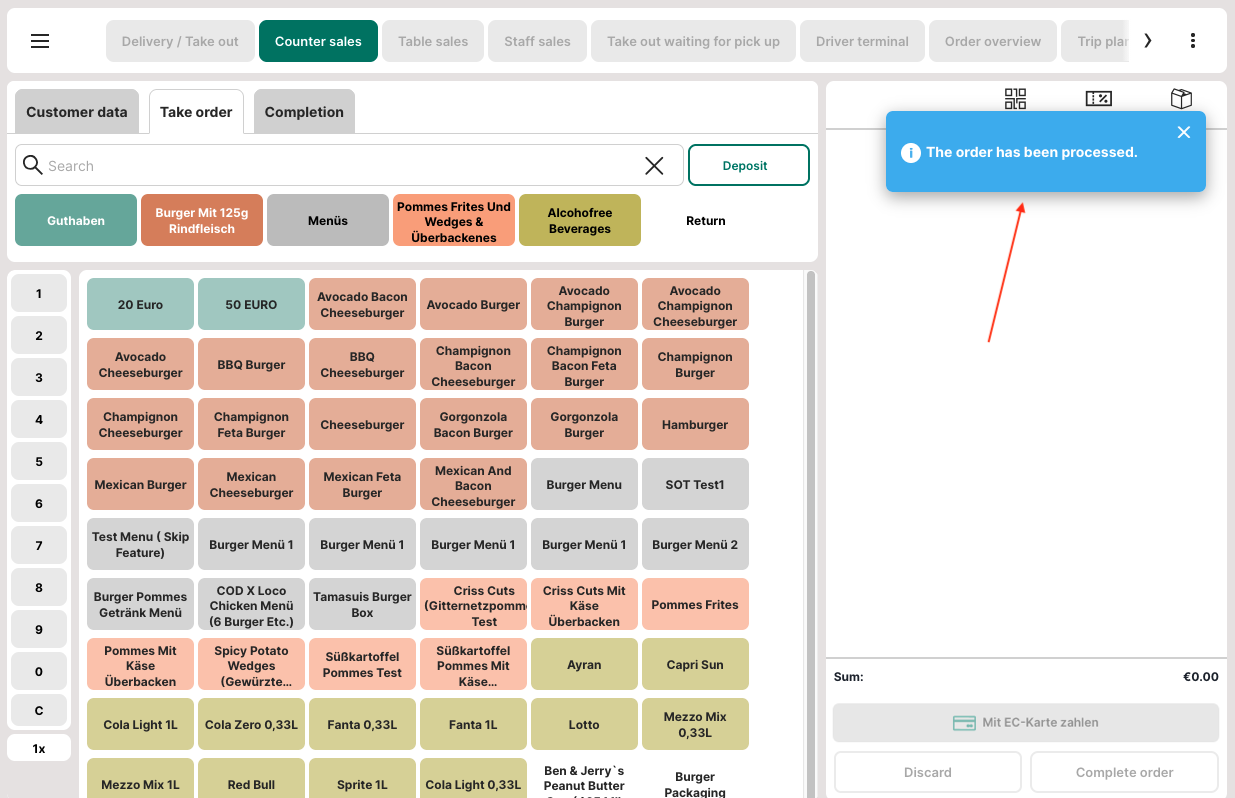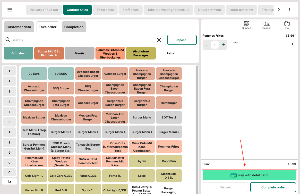 Using an additional button, an order can be completed immediately with the default payment type —ideal for Quick Service Restaurants (QSR).