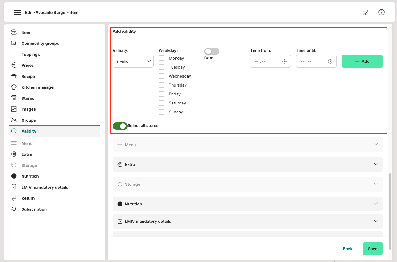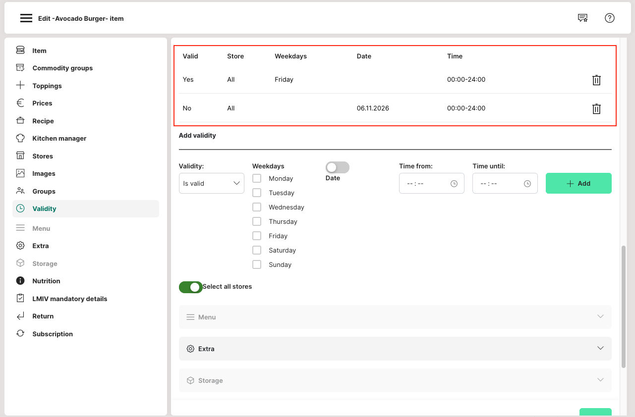 - As soon as at least one "Valid" rule exists (e.g., "Valid on 25.12."), the item automatically becomes invalid for all other periods.