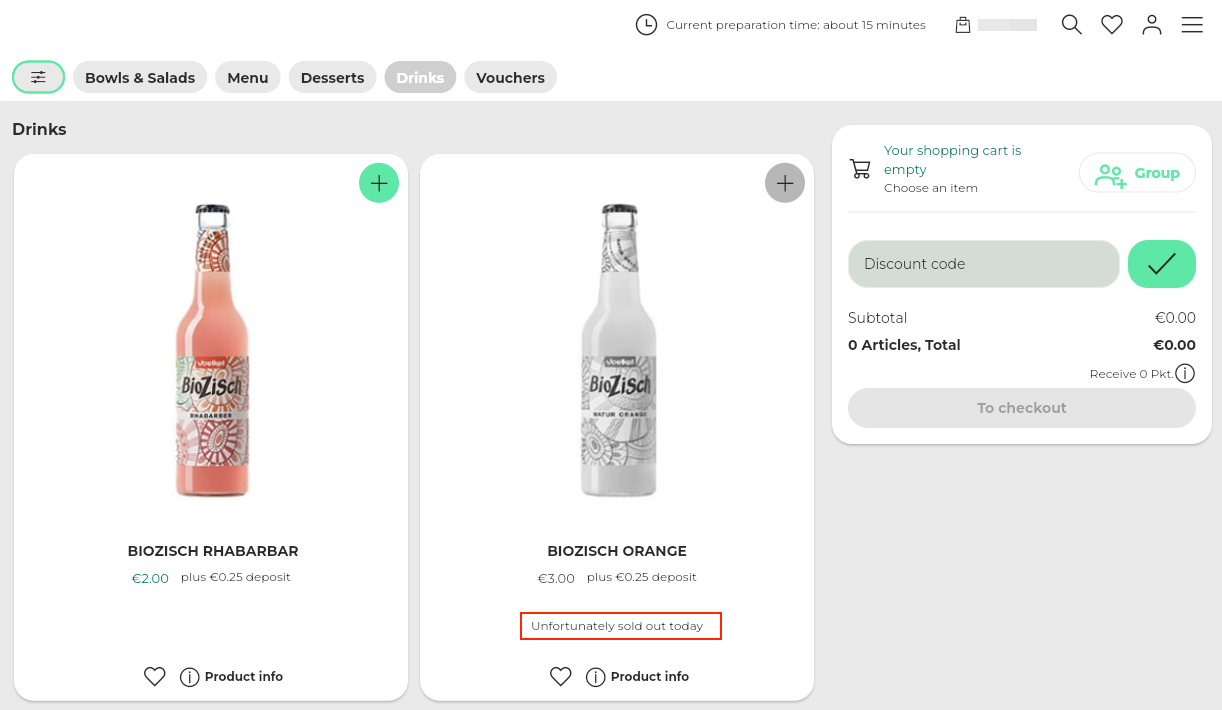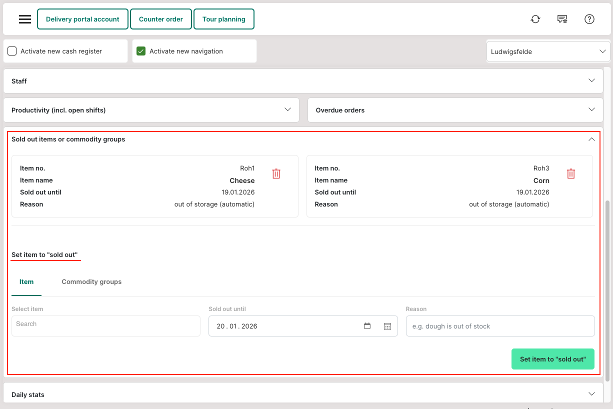 On the dashboard, under "Sold out items or commodity groups", items or categories can be marked as "sold out" until a specified date (e.g., until the next day) (under Admin/POS: Dashboard). Once this date is reached, the item is automatically shown as available again.