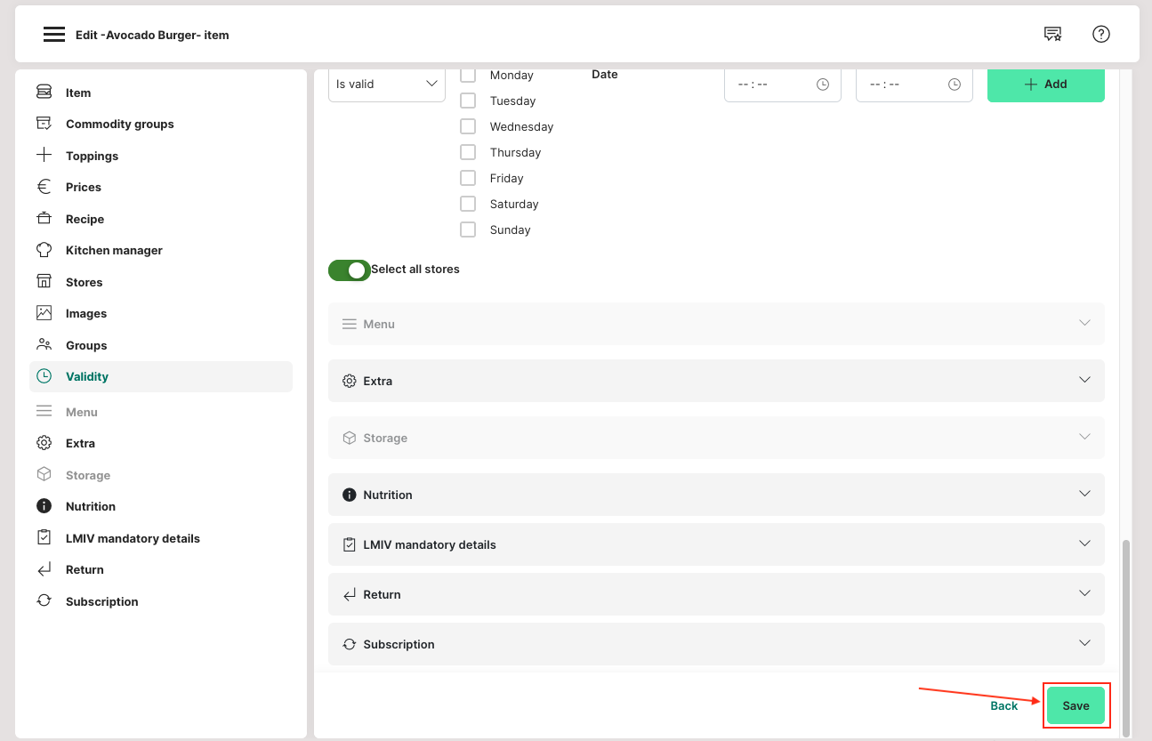 Where Admin: Item management > Item > Edit > "Validity" section.
