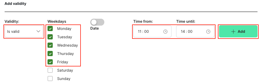 - Rule 1: Type "Valid" | Weekday: "Friday" (Makes it generally available on Fridays)
