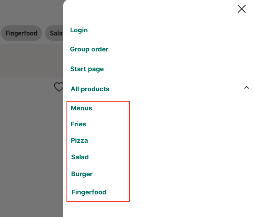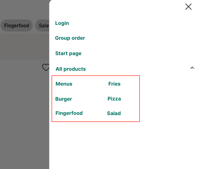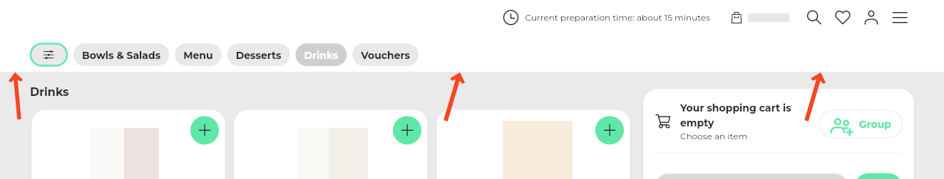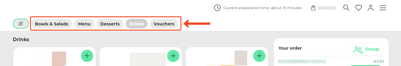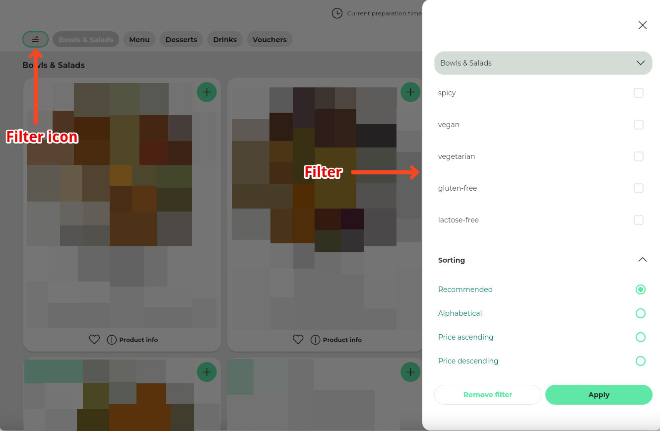 58. If you have tagged your items with item tags (item filters), customers can use the "Filters" to, for example, display only vegetarian items (provided the item settings are correct). The filter function can also be hidden. To do this, set the position of the filter icon in the drop-down menu to "Hide filter icon".