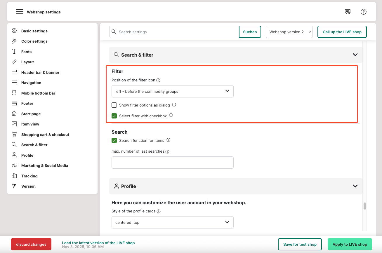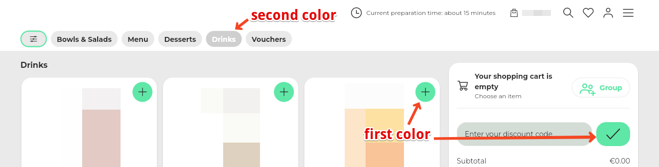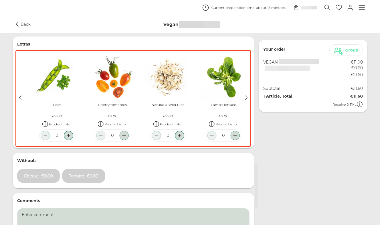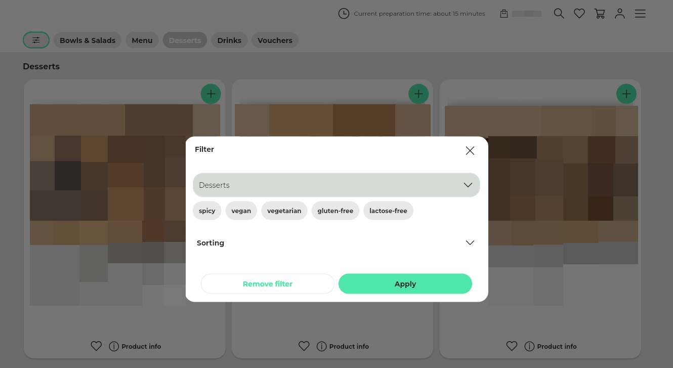 58. If you have tagged your items with item tags (item filters), customers can use the "Filters" to, for example, display only vegetarian items (provided the item settings are correct). The filter function can also be hidden. To do this, set the position of the filter icon in the drop-down menu to "Hide filter icon".