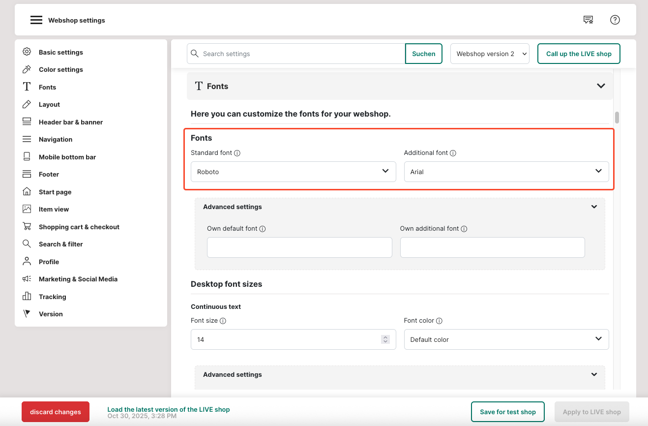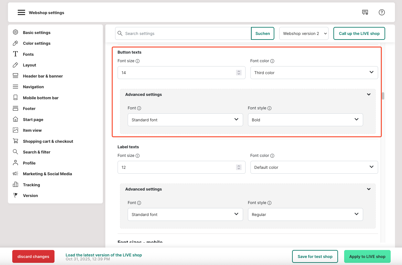 29. The settings must be configured and adjusted separately under "Font sizes - Mobile" for the "Mobile version".