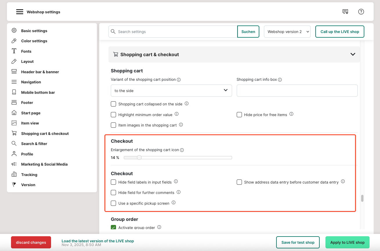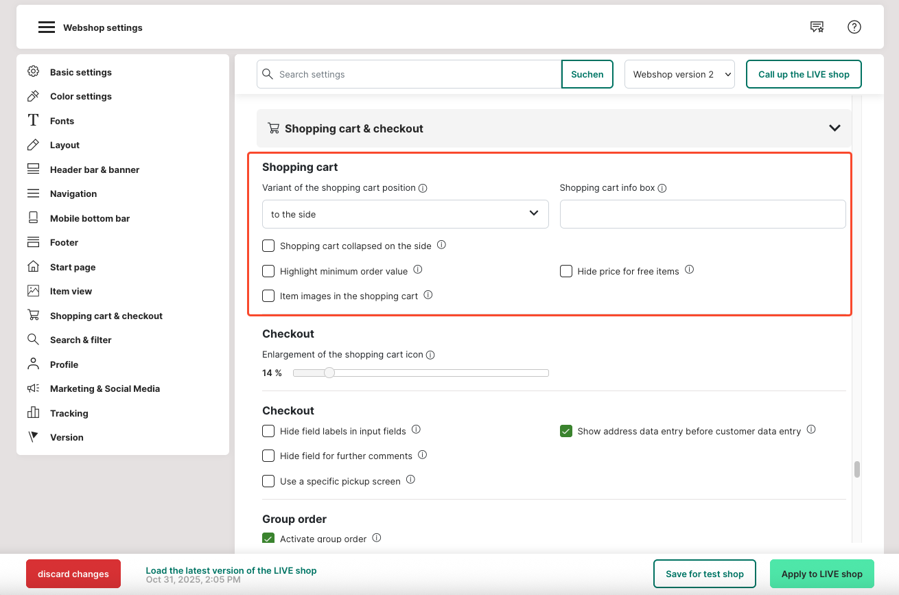 54. The "Shopping cart" is displayed to the side of the items. If you do not want this, check the box at "Shopping cart collapsed to the side". It will then only be visible when the shopping cart icon in the header is clicked. You can also choose to display the images of the items in the shopping cart.
