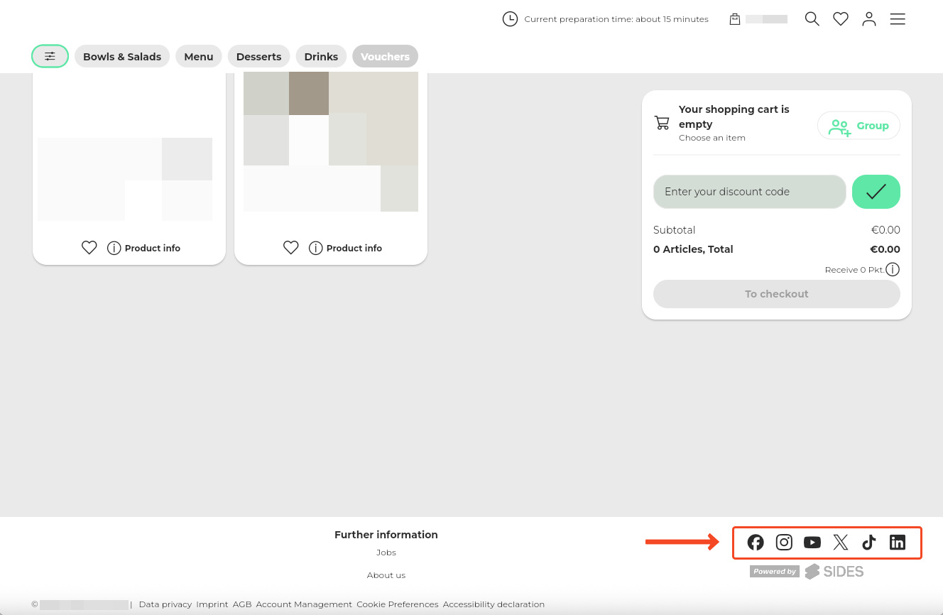 64. To achieve greater reach, you can link your social media pages in the footer. Enter the URL of your pages in the corresponding field.