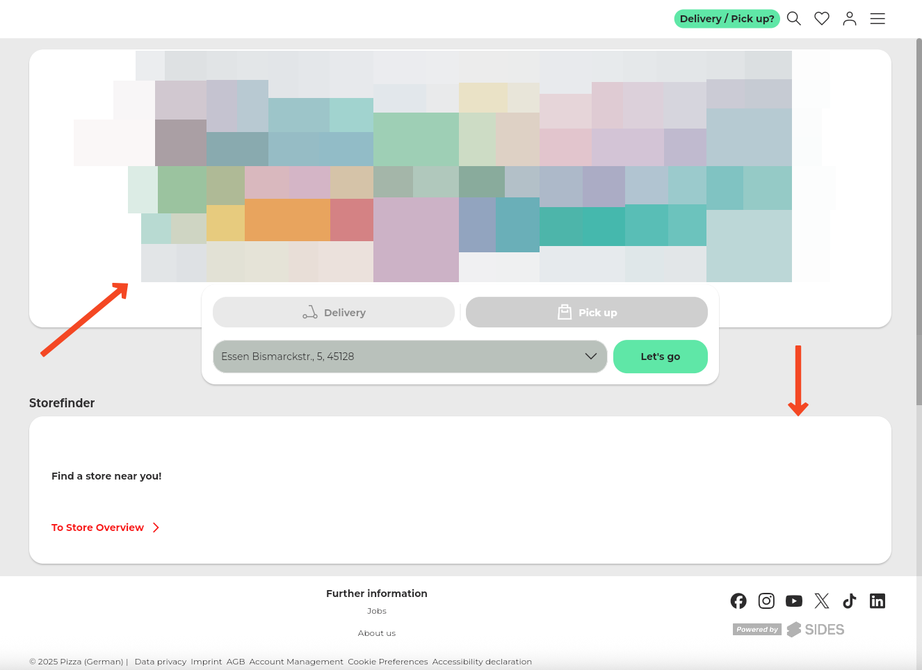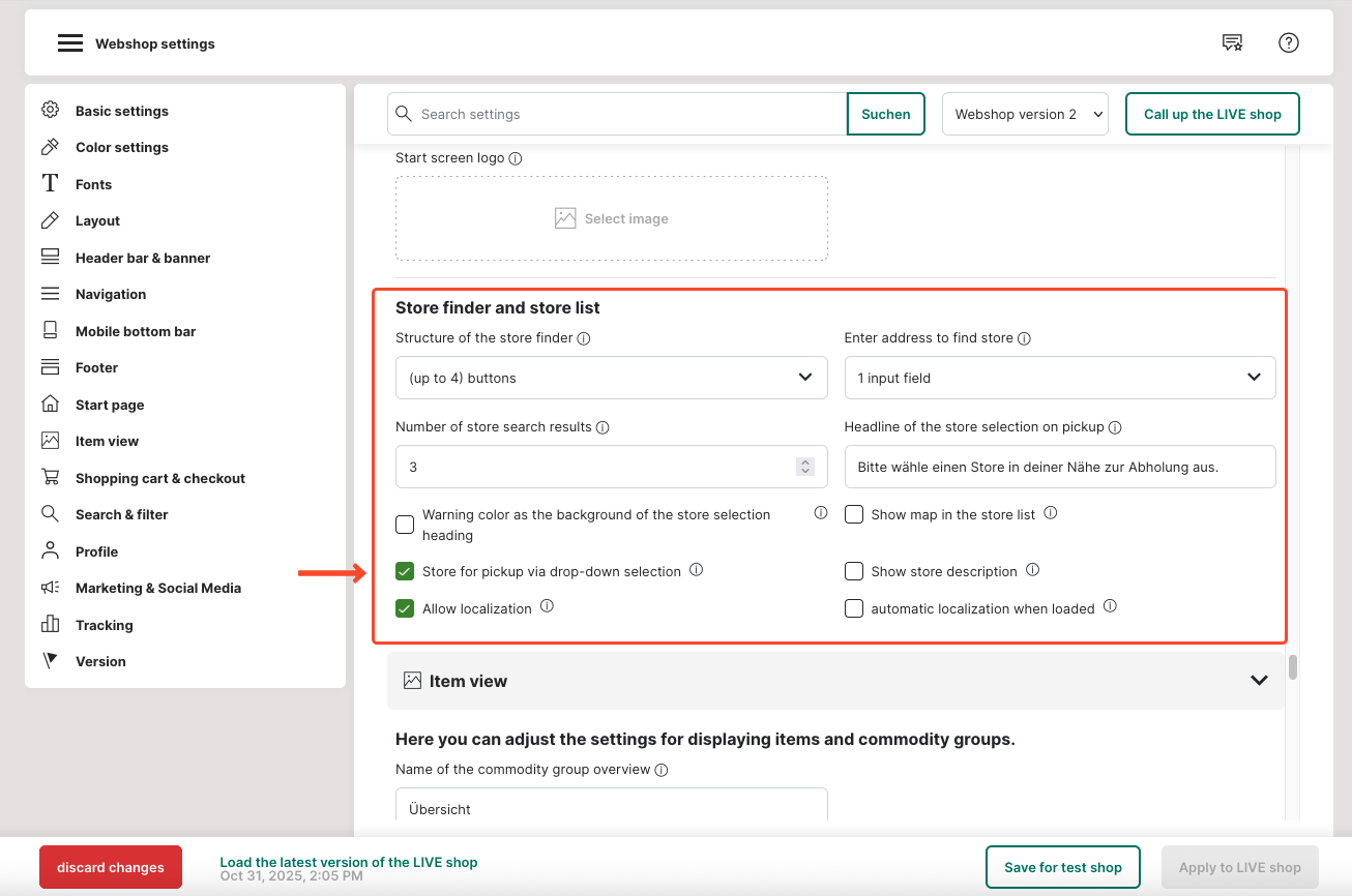 43. The settings under "Store finder and store list" are designed to simplify address entry for the end customer. For example, to prevent the customer from having to enter their address or postal code when picking up an order, this can be simplified by pre-filling store addresses via a drop-down menu (selection list).