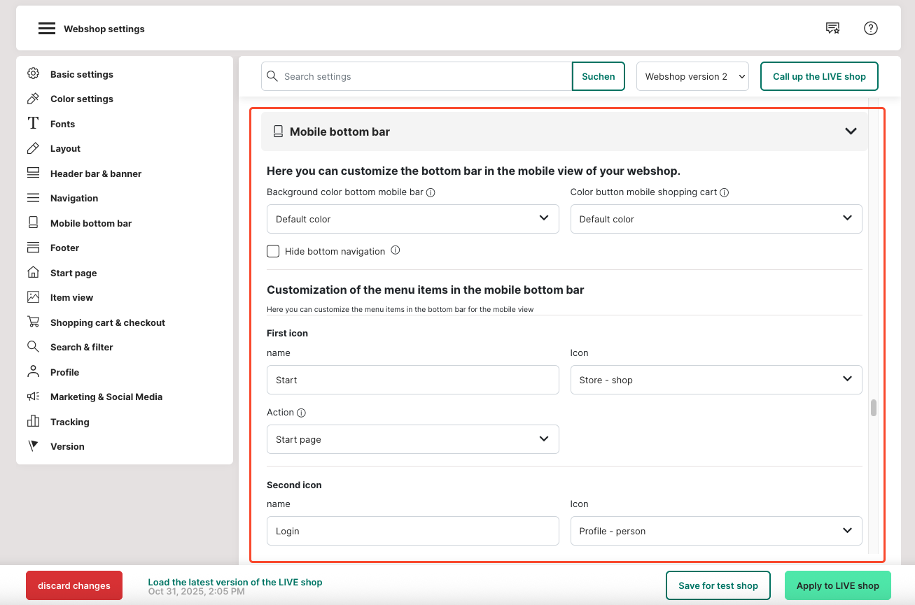 37. For the "mobile view", the "bottom bar" (lower navigation bar) is adjusted here. You can choose the different icons, functions, and their order yourself. There are a total of four icons and free spaces.