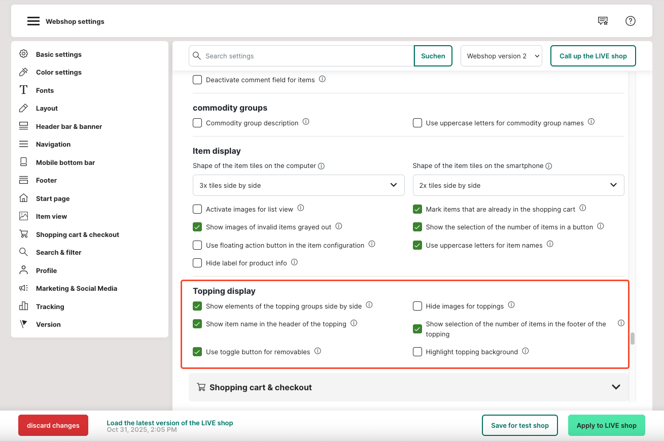 51. Under "Topping display", you can choose to display your toppings in various ways, including with images, side-by-side, etc. If you have added images to your toppings, they will be displayed, but you can disable them by checking the appropriate box.