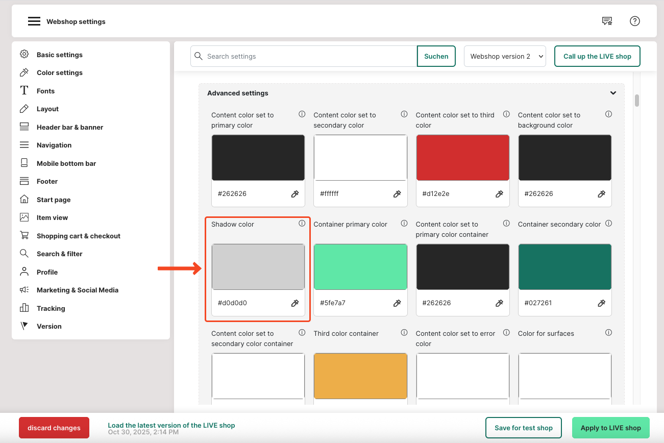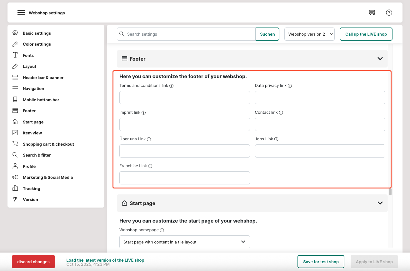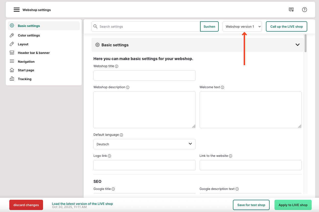3. Change the settings from "Webshop version 1" to "Webshop version 2".