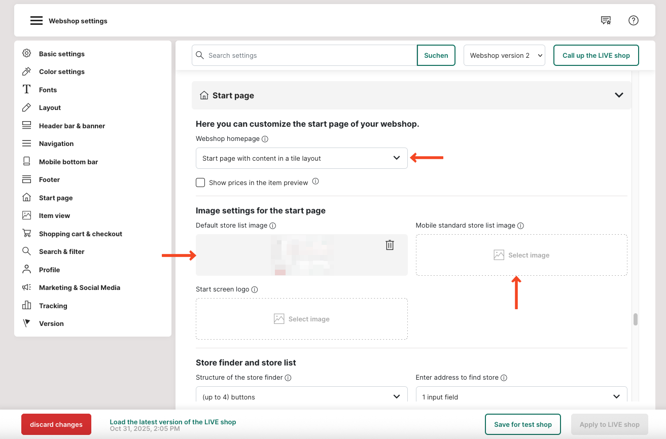 41. Under "Start page", you can upload images to be displayed on the start page. Please note that a different format is required for the mobile webshop.