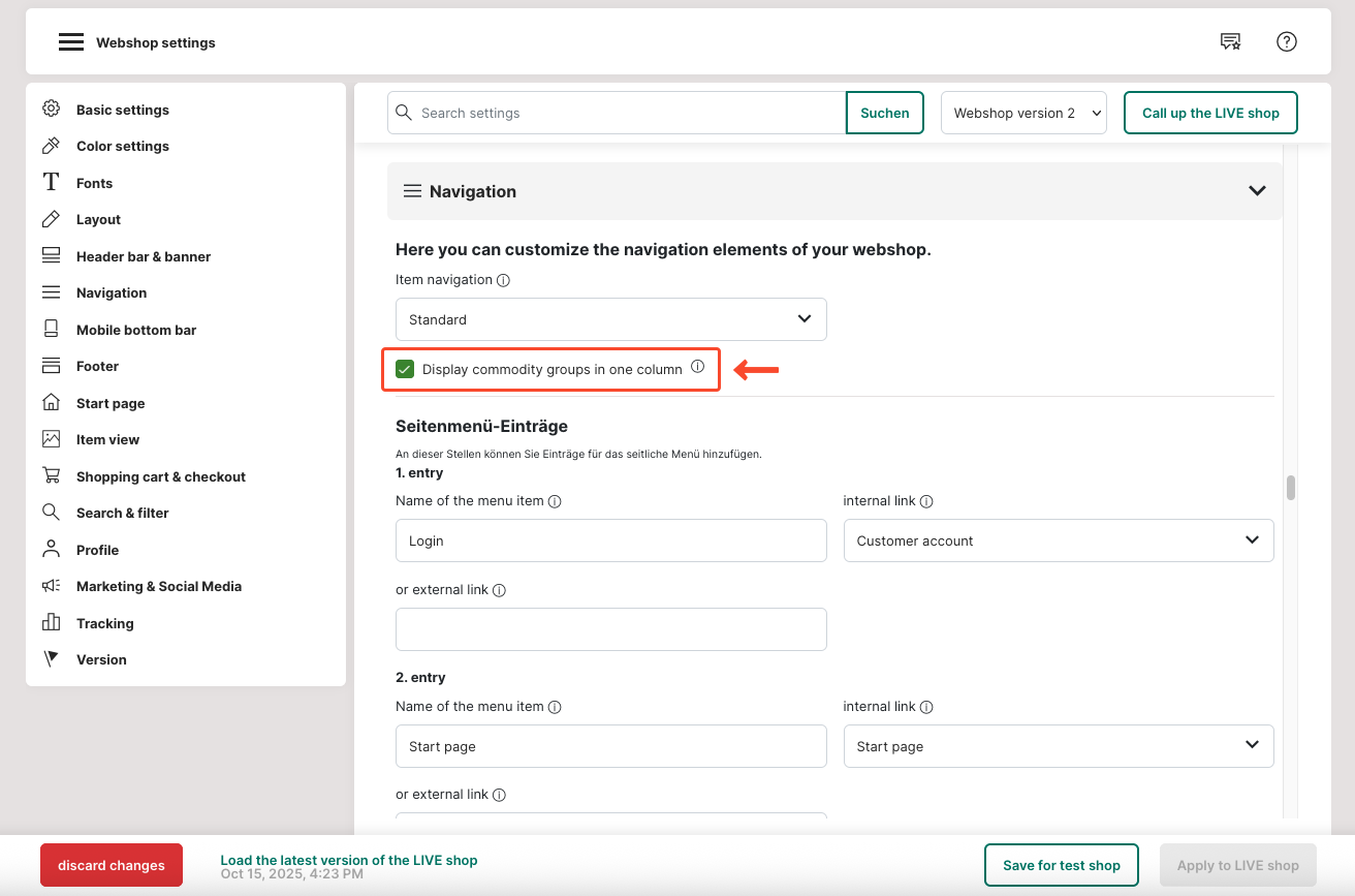 32. To display the commodity groups one below the other in the side menu, the box "Display commodity groups in one column" should be checked under "Navigation".