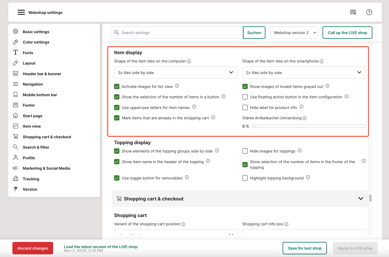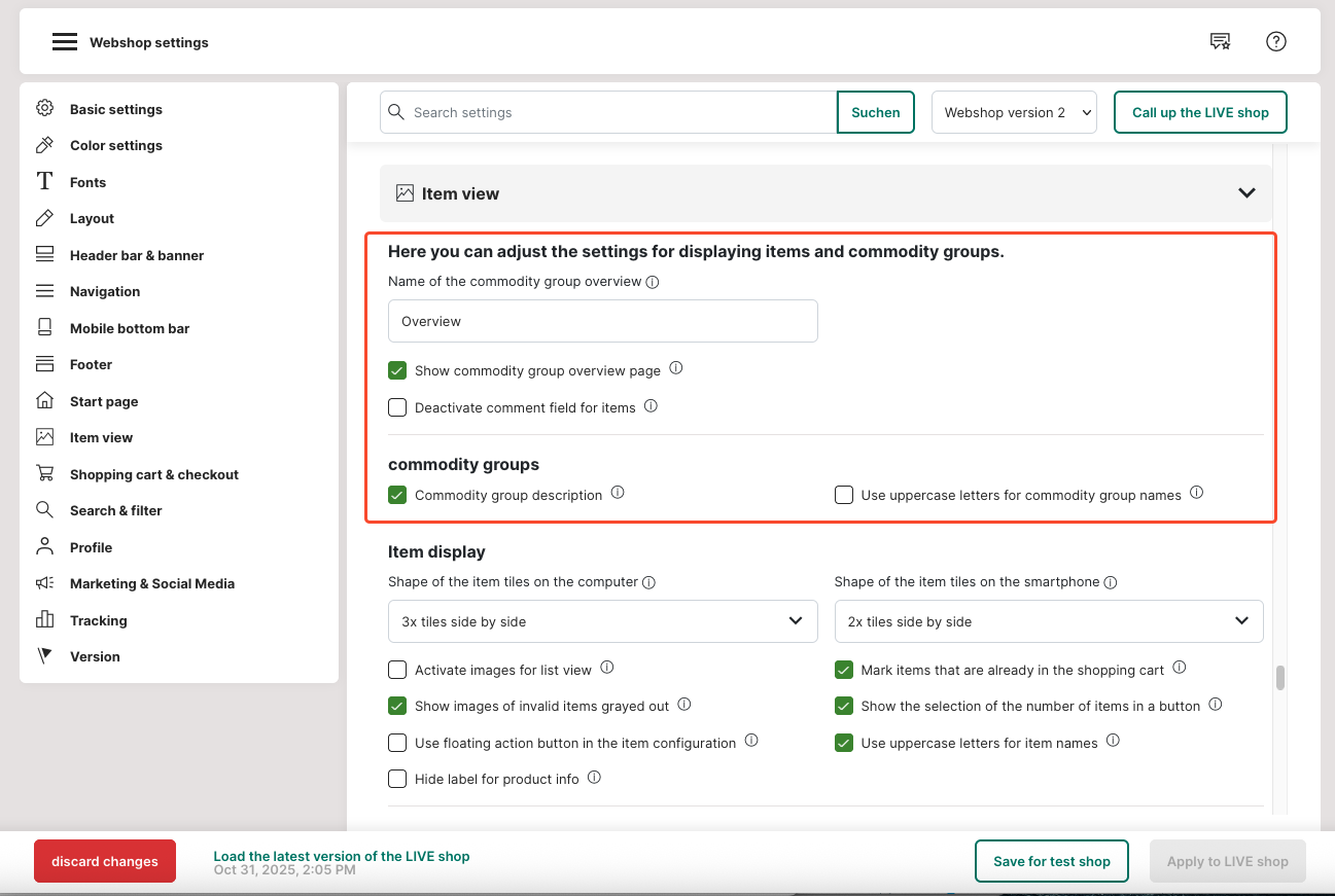 47. There are three options under "Item display" for how your items can be shown (3 tiles side by side, list view, and 1 large, 2 small tiles). A different view can be set for the mobile webshop, if desired.