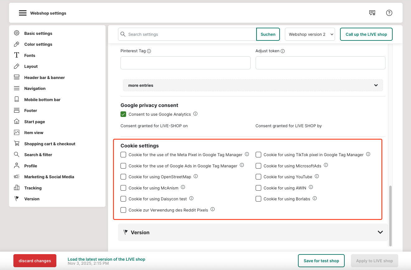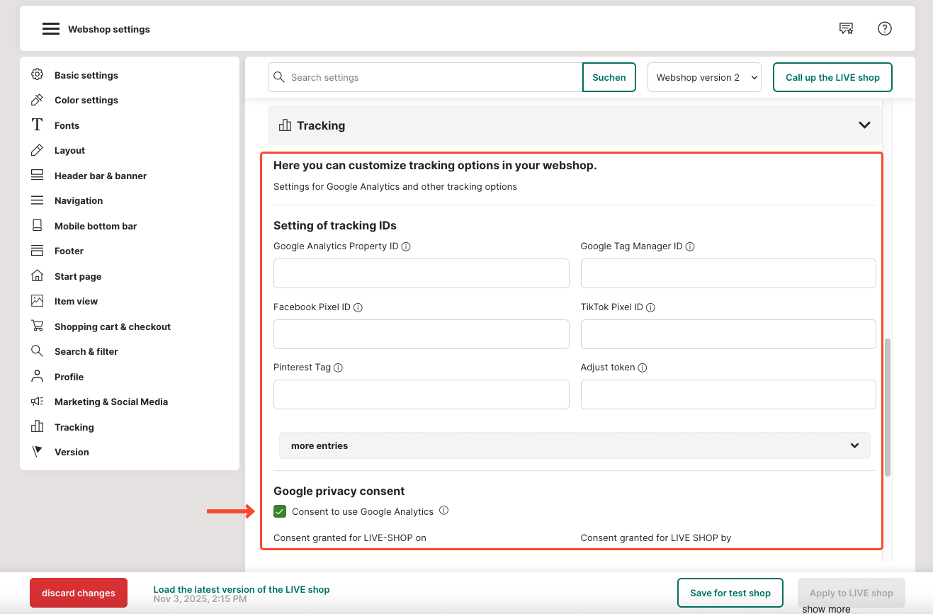 67. To track webshop usage, you can enter the various tag IDs here. Note that to use Google tags, you must activate the checkbox for consent to the use of Google Analytics.