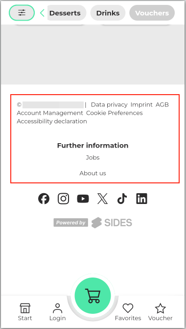 39. Here, in the footer (bottom section), you can add links to the Terms and Conditions, Privacy Policy, etc. This applies to both the browser and mobile webshop.