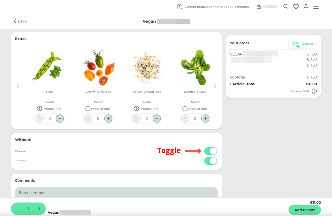 53. Example of topping display: Show item name in the header of the topping + use a toggle button for removables (deselectable items) + show selection of the number of items in the footer of the topping.