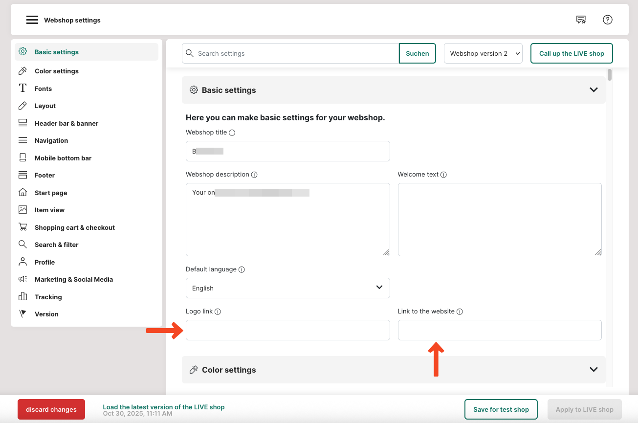 7. Under "Logo link", you can add a link behind your logo in the webshop if you want users to be redirected to a specific page when they click on your logo.