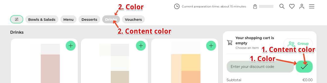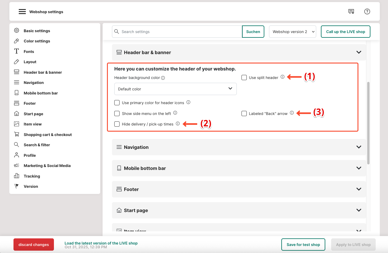 30. Under "Header bar & banner", you can customize the header. You can display your header in two different colors using the "Split header" option (1), hide the "delivery and pickup times" (2), and label the "Back arrow" (3).