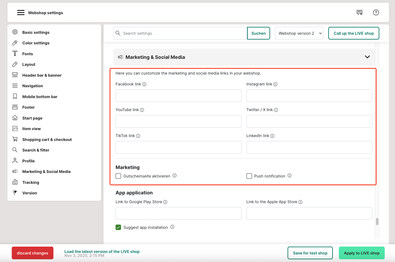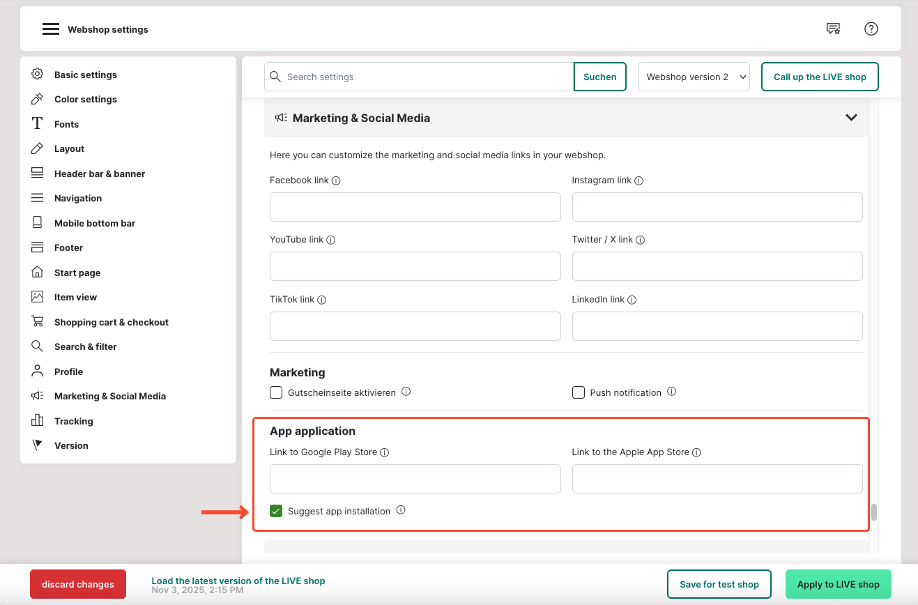 To suggest installing the app when someone visits your webshop, check the "Suggest app installation" box.