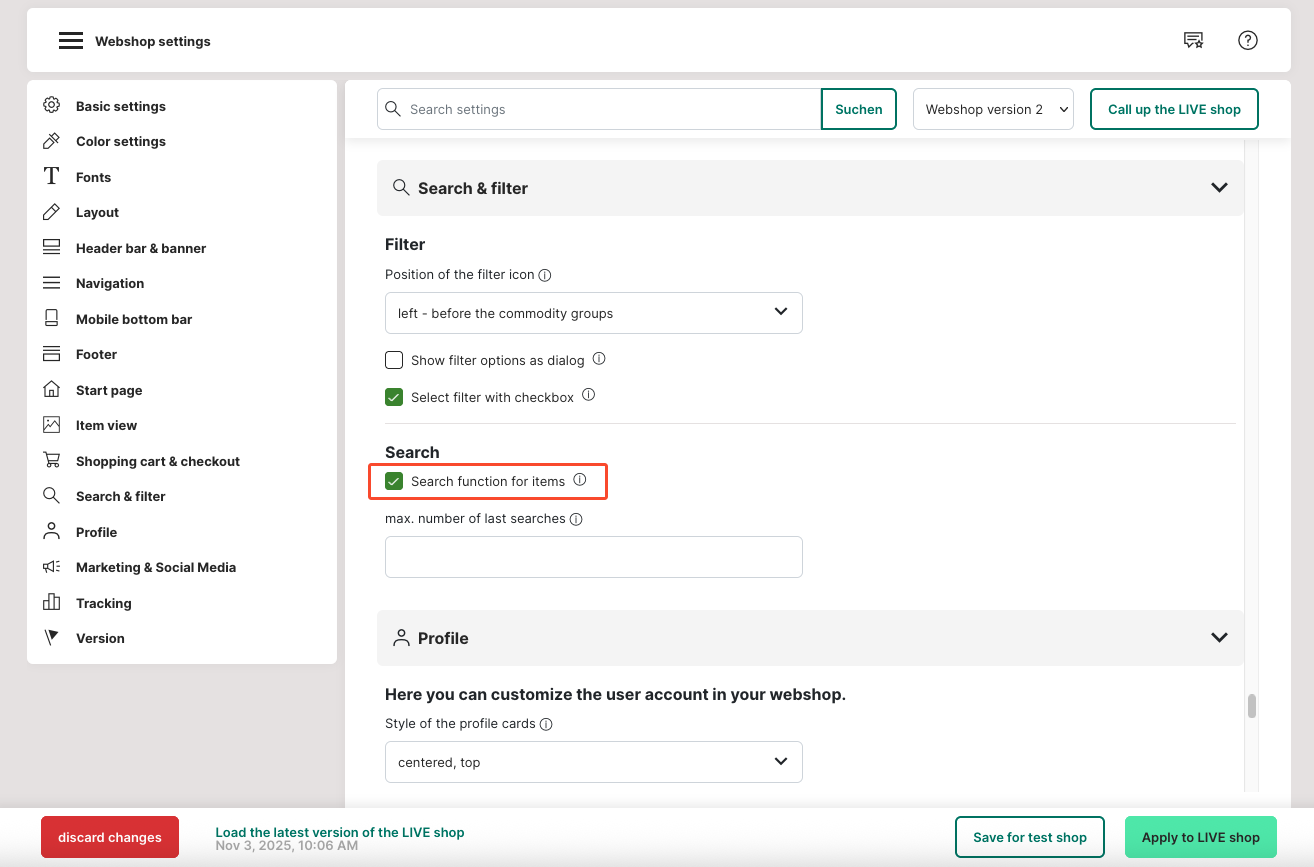 61. To allow customers to search for items in your webshop, activate the function by checking the "Search function for items" box. The search function will then appear at the top of the header.
