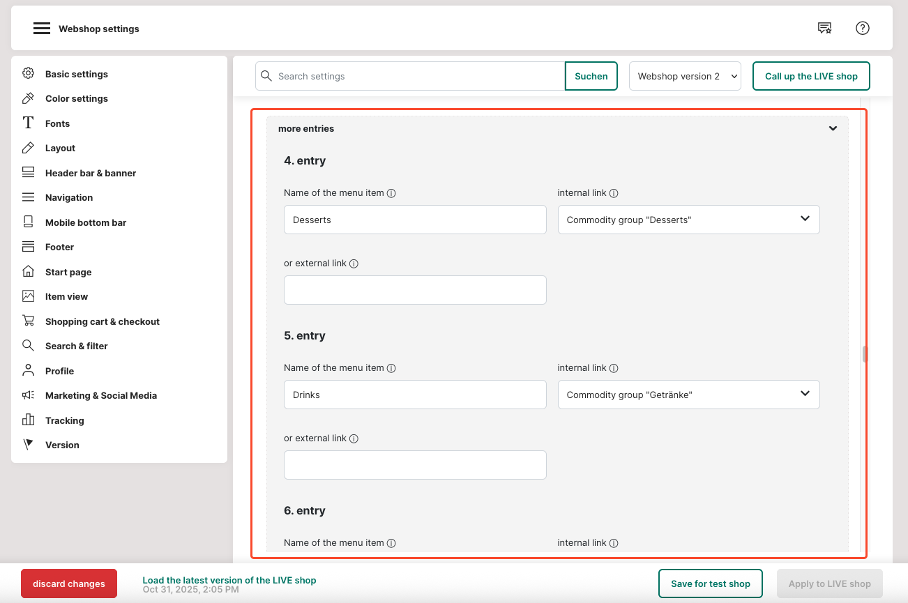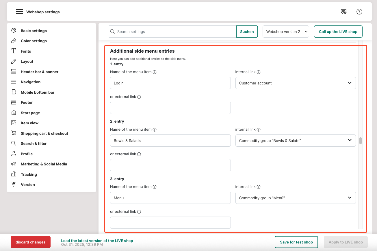 36. If you click on "more entries", you can add and configure additional items for your side menu (max. 12).