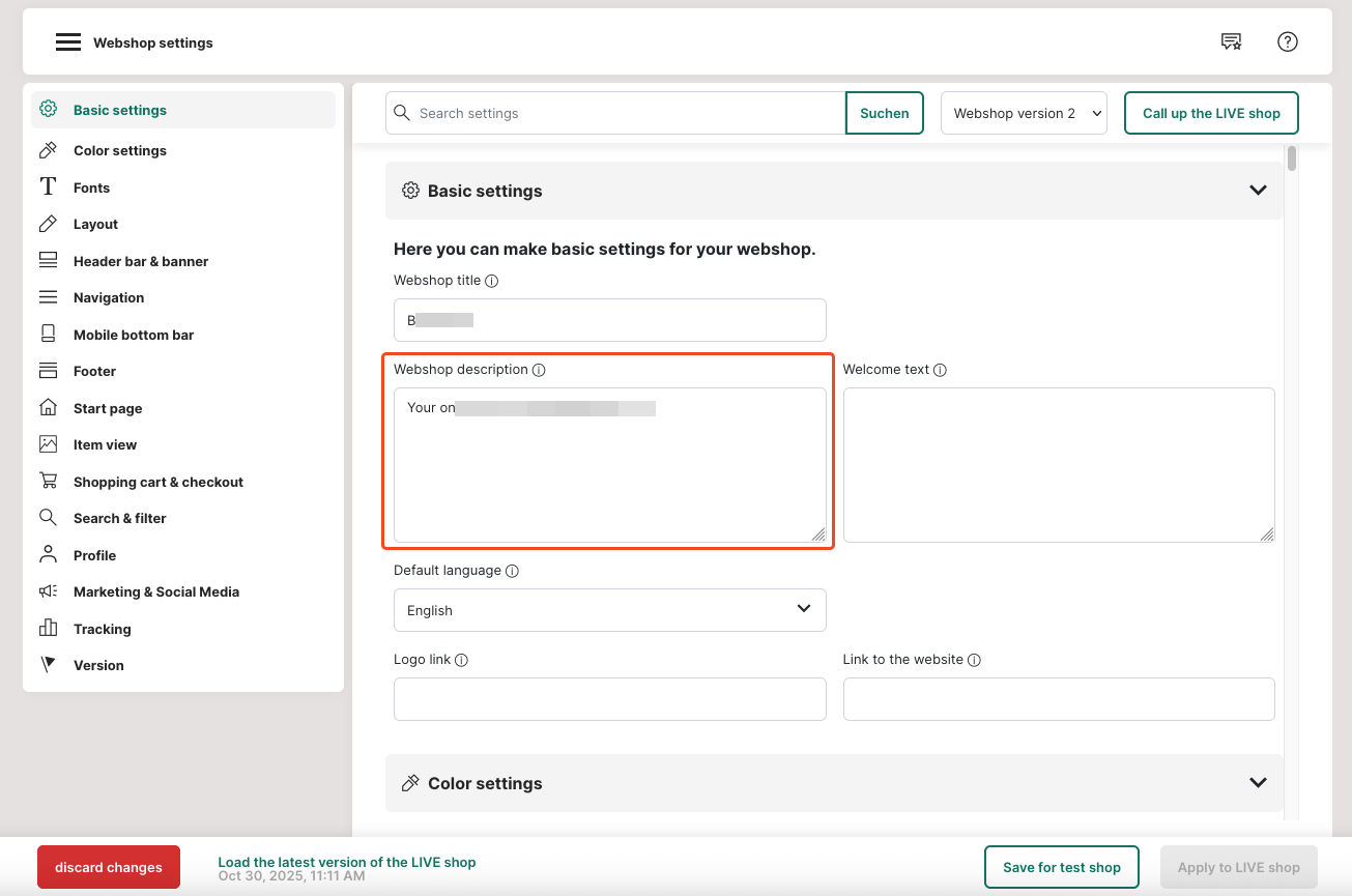 6. In the "Webshop description" field, you can enter a description for your webshop. This will also be used by various search engines to suggest your webshop.