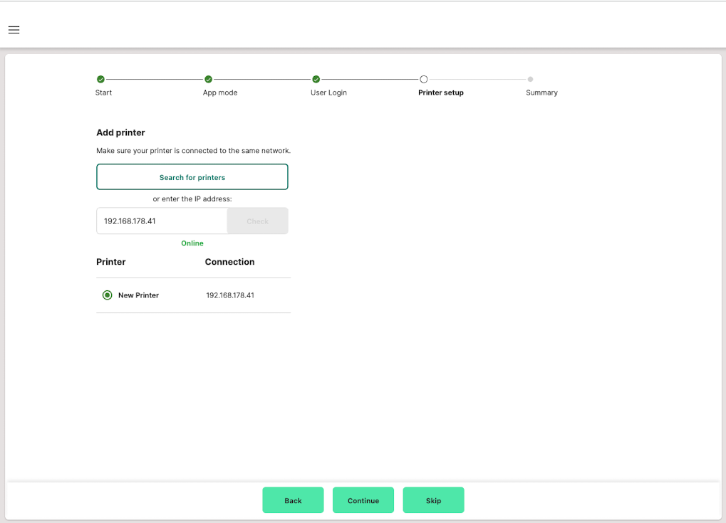 Or: Enter your printer's IP address and click "Check". - Once the printer is shown as "Online", you can select it.