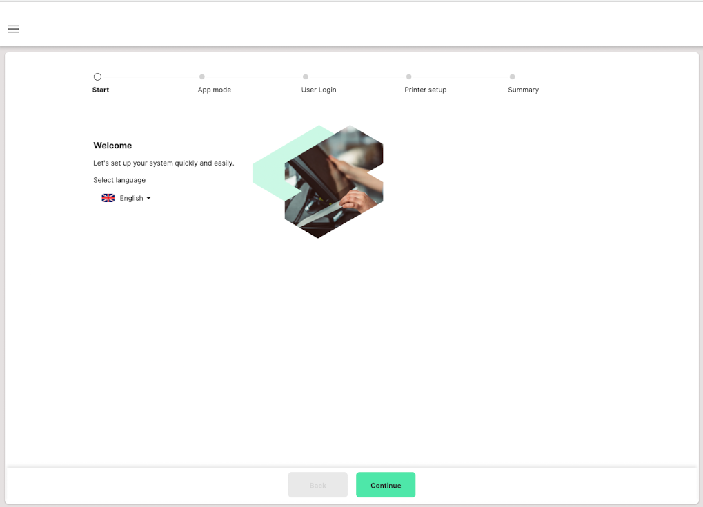 The setup assistant guides you step by step through the basic configuration of your SIDES app. This allows you to quickly and reliably set up the language, operating mode, user access, and printers.