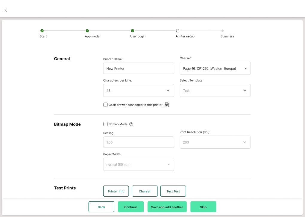 In the printer overview, this printer is additionally marked with a cash register icon. - Optional: Enable "Bitmap Mode" (if you want to print unsupported characters as a bitmap) and adjust scaling/paper width.