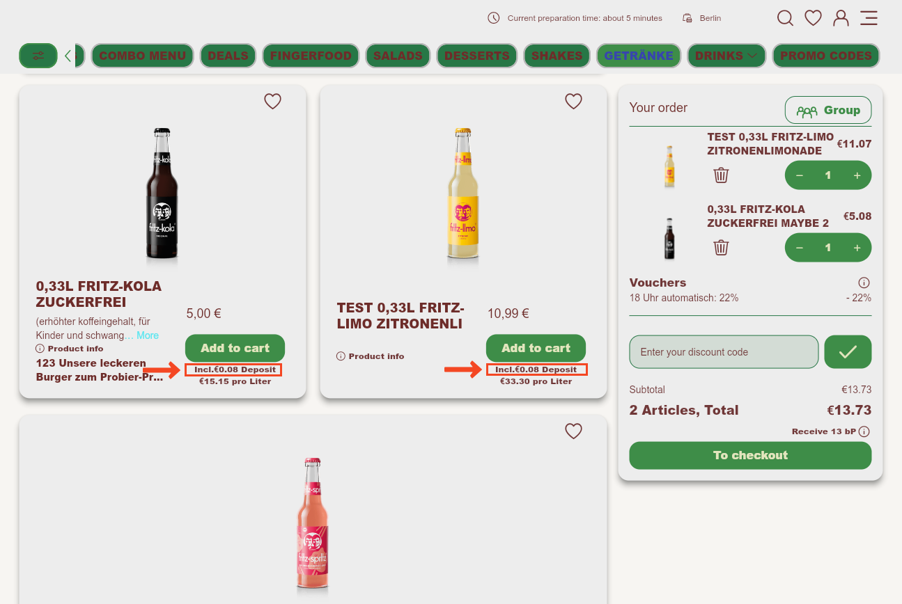 - Menu selection and shopping cart: The deposit is shown directly for each individual item and listed in the shopping cart as an additional, separate line item per product.