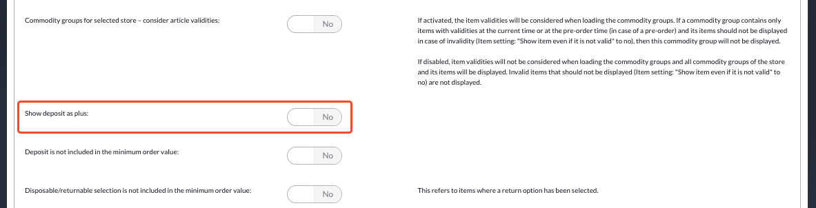 The "Show deposit as plus" option can be used to control how deposit amounts are displayed to the user in the webshop or app.