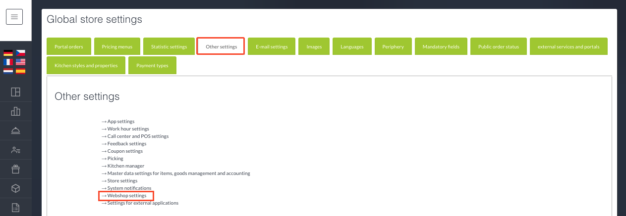 - Navigate to Admin: Global settings > Global store settings > Other settings > Webshop settings.