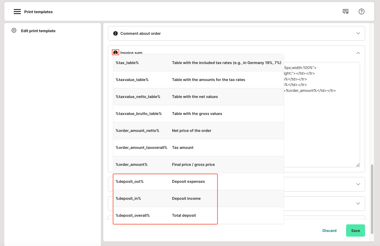The following placeholders are available for this purpose under Admin: Hardware > Print templates > Edit > Invoice sum.