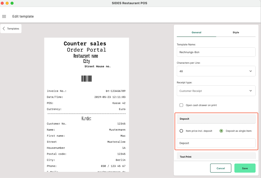 In the Restaurant POS app, you can specify in the print templates whether the deposit should be displayed as an inclusive item or as a separate item (under Restaurant POS app: side navigation menu > Print templates > Edit > Deposit).