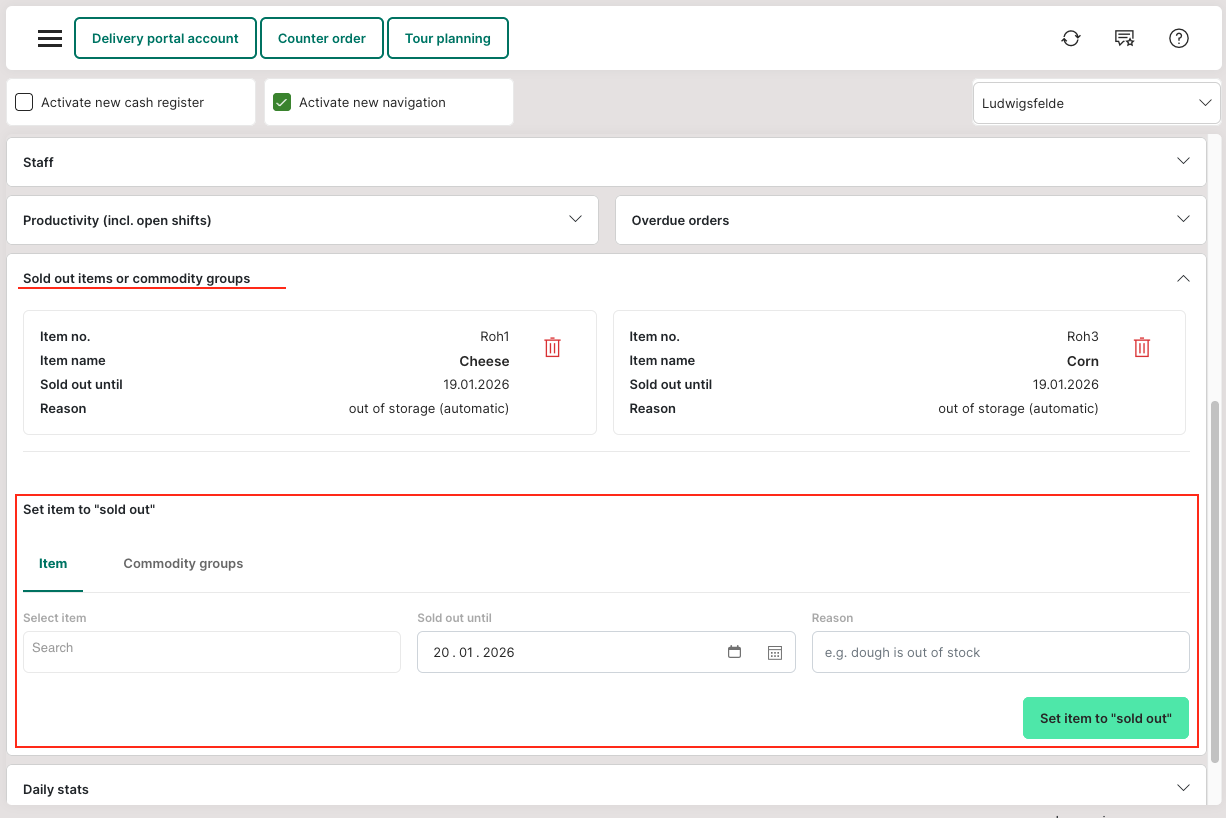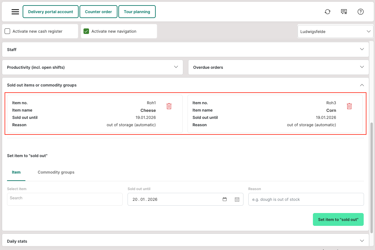 In the dashboard, items or product groups can be marked as "sold out" under "Sold out items or commodity groups" until a specified date (e.g. until the next day). This prevents the purchase of these items.