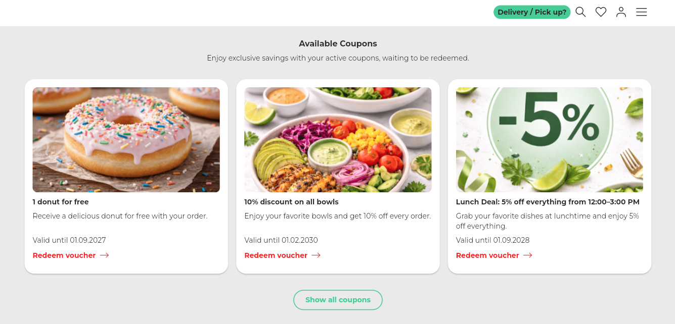 - A button labeled "Show all coupons" that takes your customers either to a complete list of all available savings or directly to your menu.