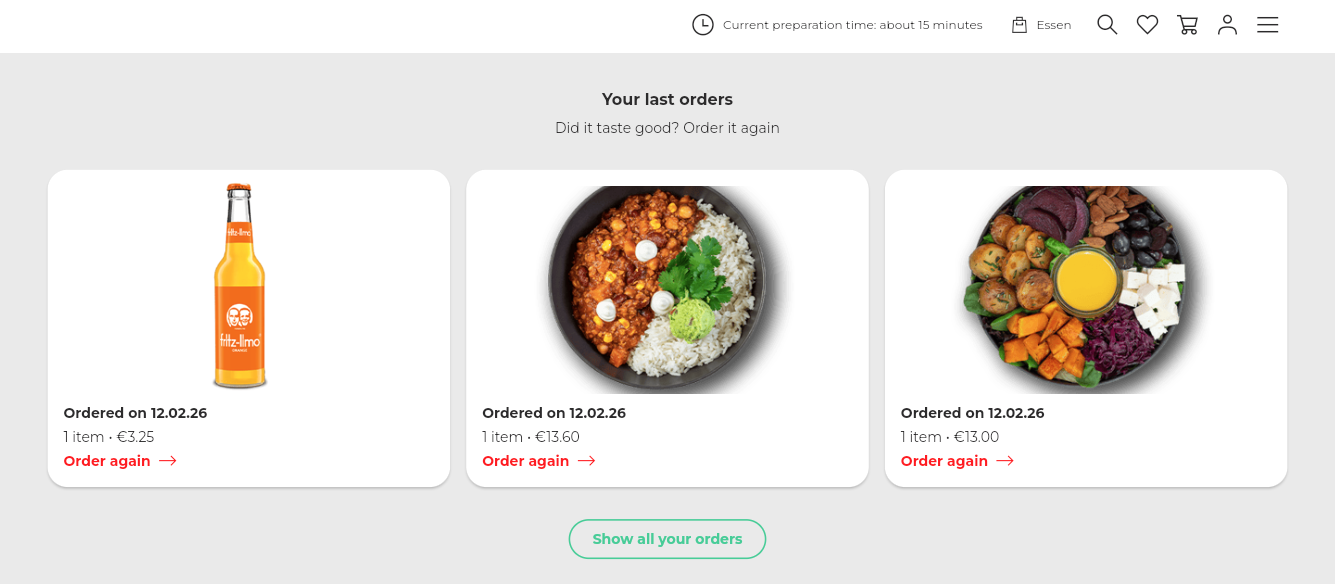 - The main heading "Your last orders" along with the subtitle "Did it taste good? Order it again".