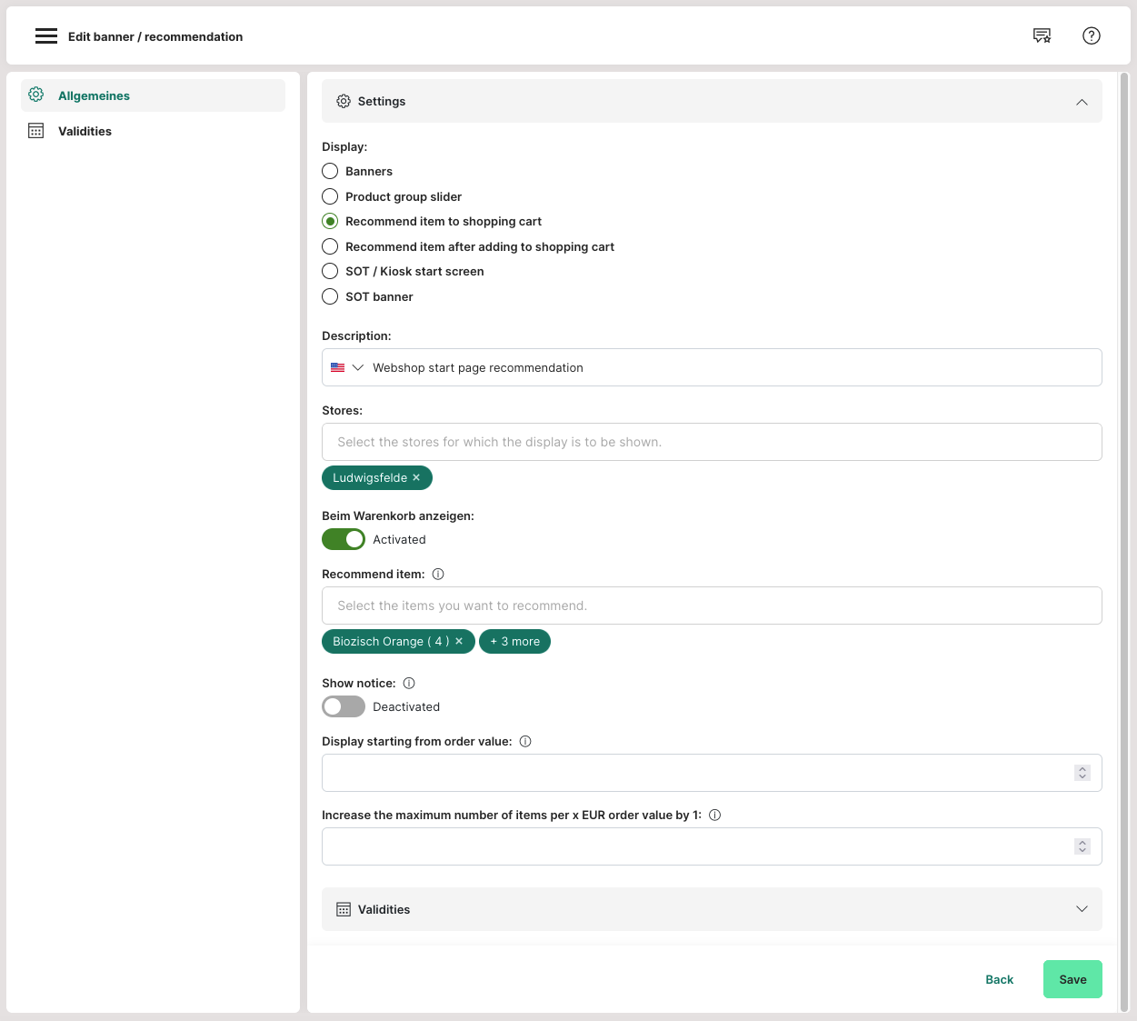 Note: Without a defined validity period, the recommendation will not be displayed. - Click "Save" to activate the product recommendation.