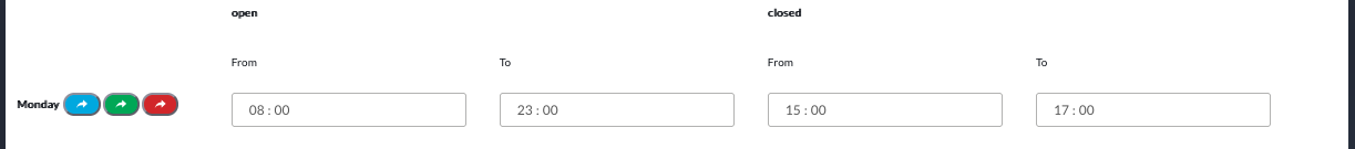 If you are only open for a certain period on a public holiday or day off, the day needs to be set up slightly differently. For example, if you are only open from 3 pm to 5 pm, the closing day must be defined as follows: