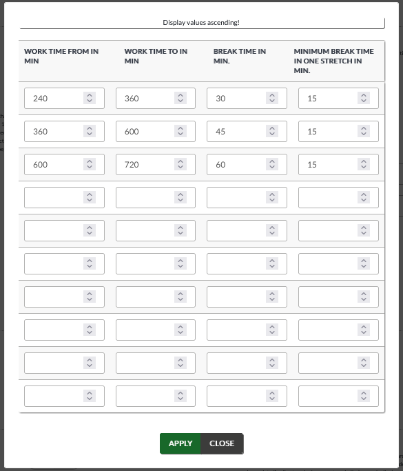 Strict rounding: Strict rounding always rounds to the employee's disadvantage and is only logged in 15-minute increments. So, if a driver logs in at 3:01 PM, the system logs 3:15 PM as the login time. The system therefore always logs the time to the next 15-minute mark. When logging out, the time is rounded to the last 15-minute mark. So, if the employee logs out at 8:14 PM, the system logs 8:00 PM.